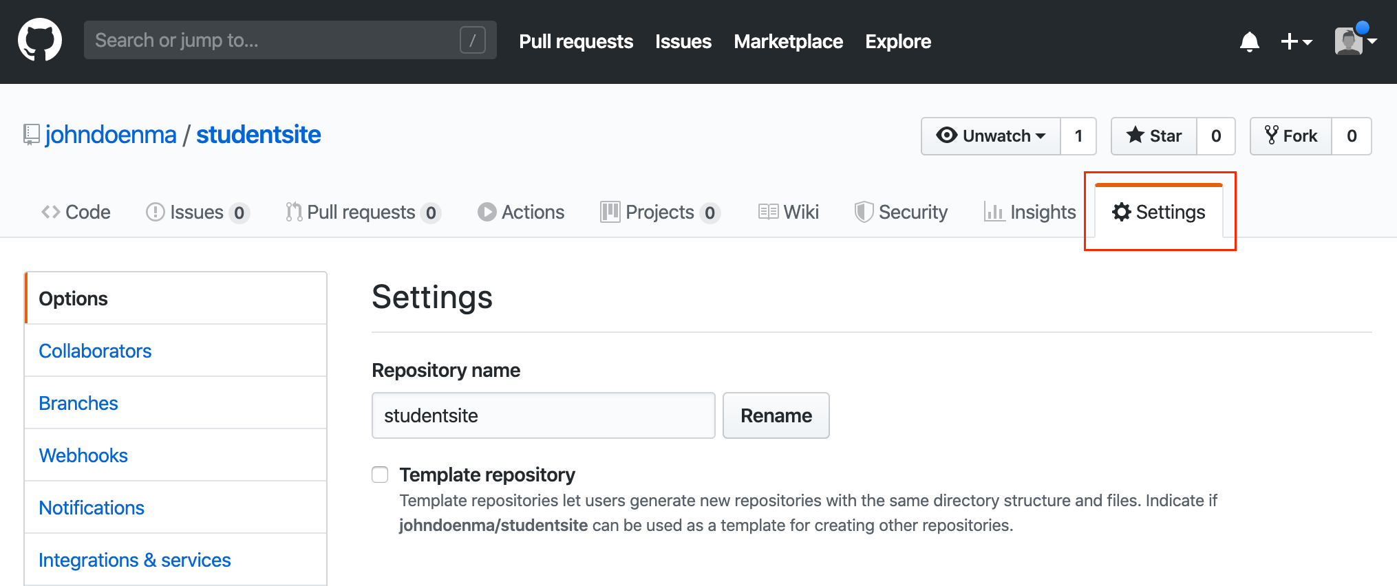 • Be sure to name your new repo “studentsite” (all lowercase, no spaces)