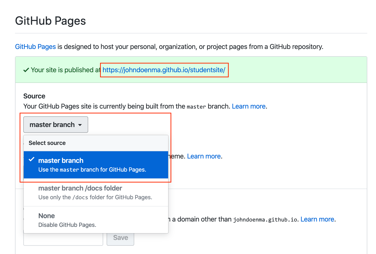 Once you have completed the syncing process (which consists of three parts: 1. stage + 2. commit w/ a comment + 3. push), you can then open your browser, go to your Github repo, go to the Settings tab, scroll down to GitHub Pages, choose Master branch for your GitHub Pages.
